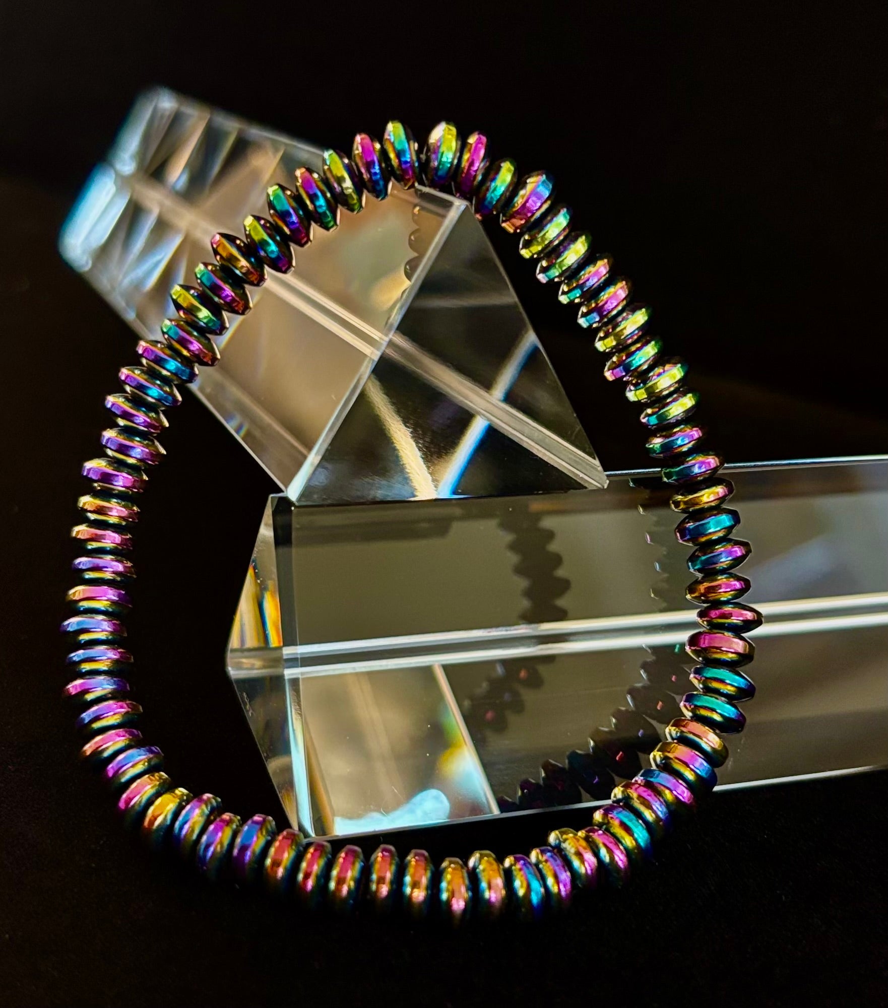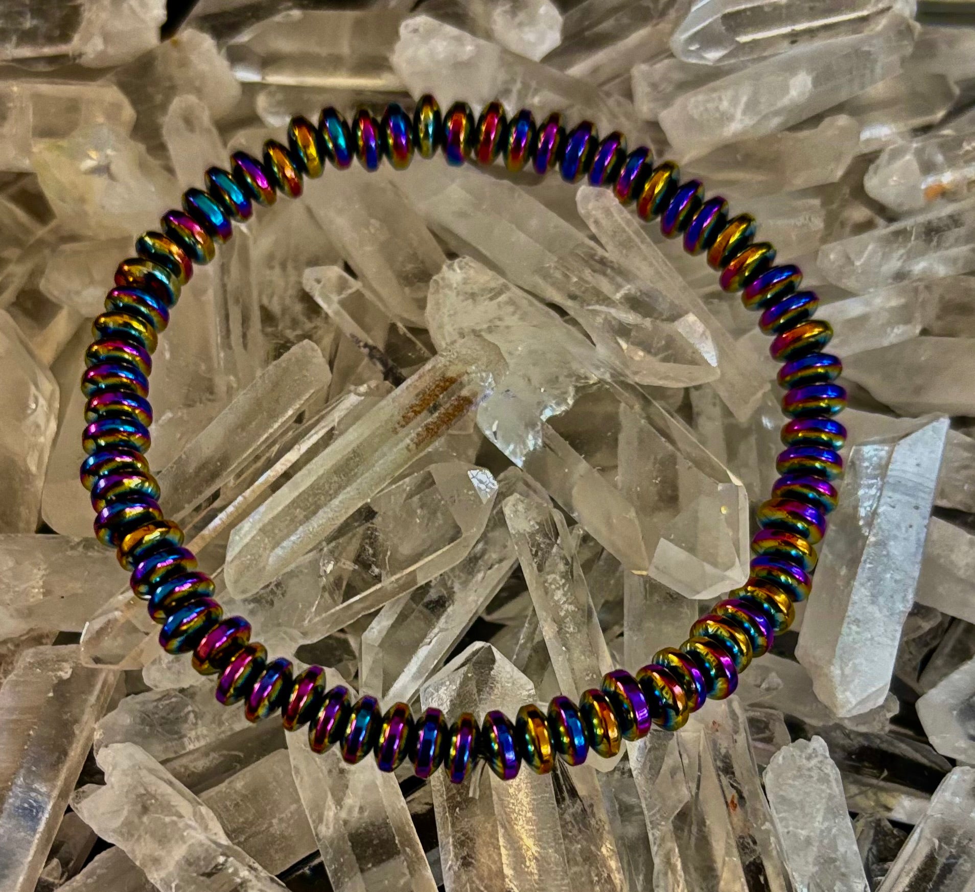 Add effortless style to your look with this sleek Rainbow Hue Metal Bracelet, designed for medium to large wrists. Crafted with metallic rondelle beads that shimmer in a spectrum of rainbow colors, this bracelet offers a bold yet versatile statement.
