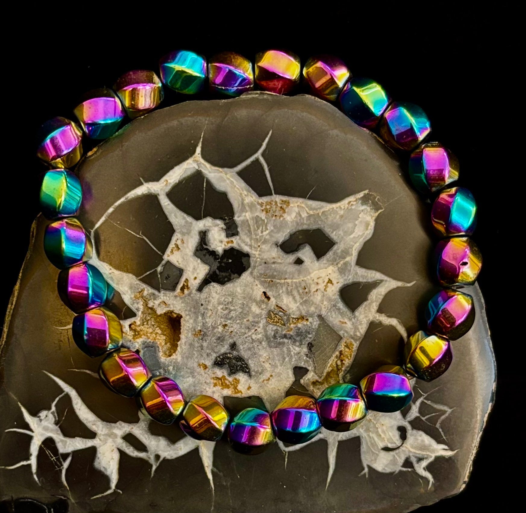 Hematite is celebrated for its grounding and protective properties, helping to absorb negative energy while promoting confidence and strength. Combined with its dazzling rainbow sheen, this bracelet is more than just an accessory—it’s a symbol of resilience, unity, and celebration of who you are.